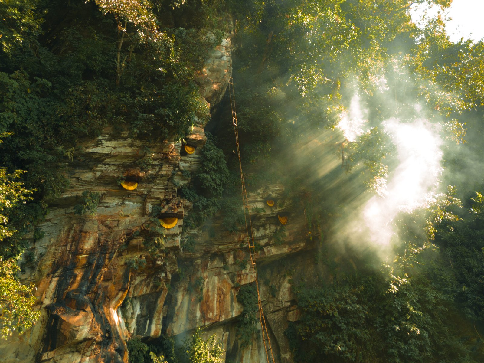 Mad honey harvesting is a part of Nepalese culture that is held twice a year in spring and autumn, and it is carried out through ritualistic practices, which have been transmitted over generations. Gurung people have been practicing this risky art for centuries, climbing cliffs with the help of the traditional rope ladders and smoke to make the huge bees calmer to harvest honeycomb pieces.